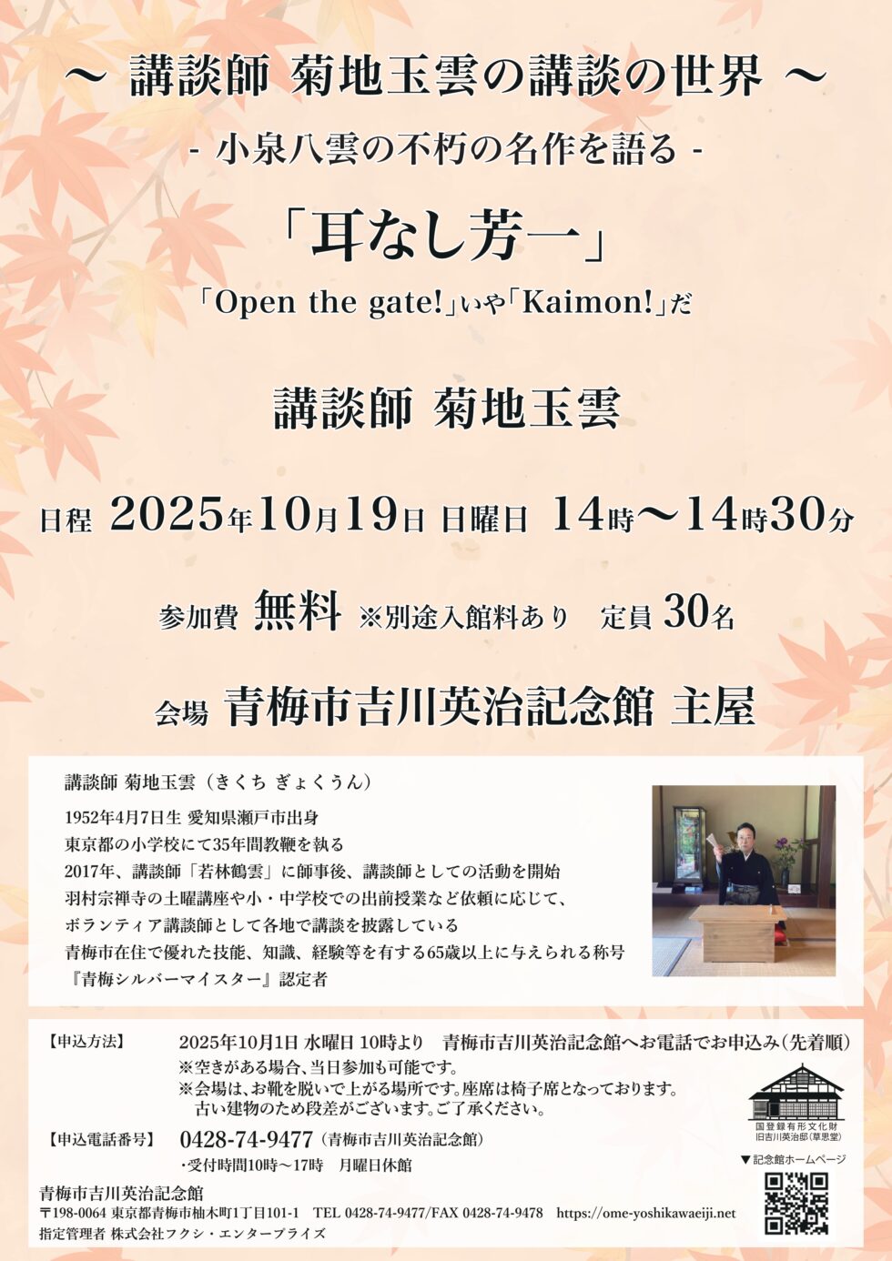 【申込方法】2025年10月1日 水曜日10時より青梅市吉川英治記念館にお電話でお申し込み(先着順)