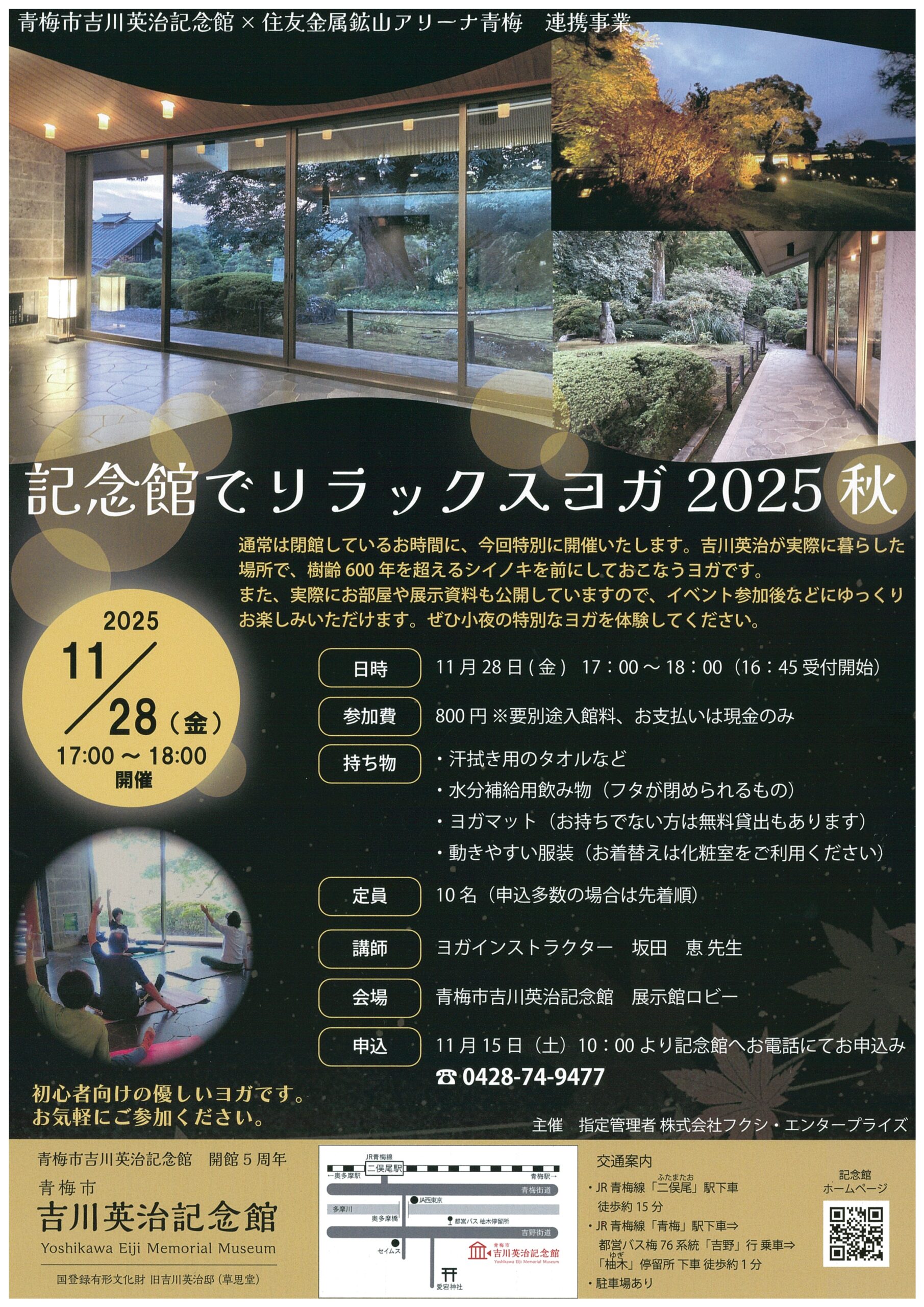 【受付終了】青梅市吉川英治記念館でリラックスヨガ 2025 秋