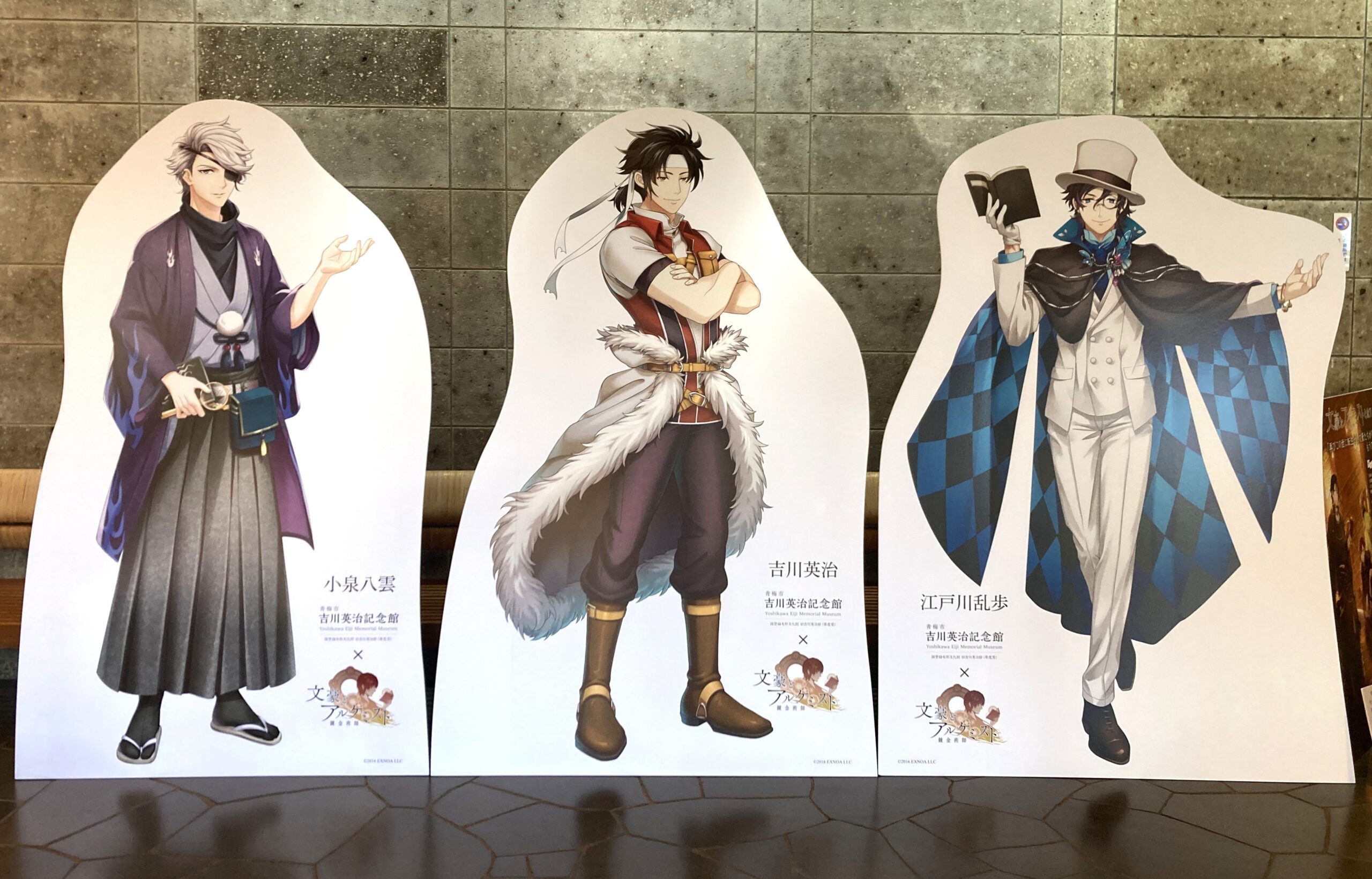 〇第3弾の期間中、ご来館された皆様に「使い捨てカイロ+文豪とアルケミストポストカード」をプレゼントします。(※お一人様につき1セット) 〇等身大パネルの設置 第1弾から引き続き、全期間中、「吉川英治」「小泉八雲」「江戸川乱歩」の等身大パネルを、記念館の展示館ロビーにて設置します。 また、ミュージアムショップにて文豪風和装の「吉川英治」パネルも設置します。 ご来館の記念にぜひ写真撮影などお楽しみください。 〇全期間中、特製グッズとして、 下記のグッズを販売します。 ご来館の記念にぜひお手に取ってご覧ください。 ・「吉川英治」「小泉八雲」「江戸川乱歩」 アクリルスタンド 各990円(税込) ・「吉川英治」「小泉八雲」「江戸川乱歩」 モクリルスタンド 各990円(税込) ・全9種類ランダム缶バッジ 1つ660円(税込)